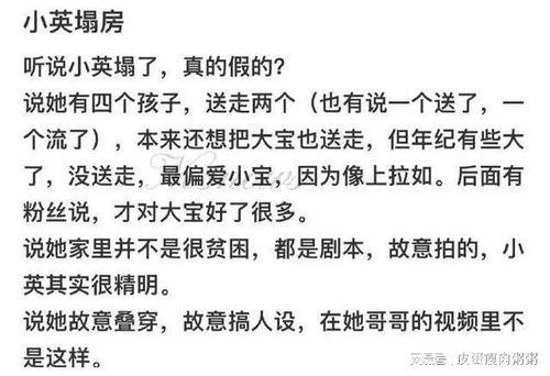 在这个事件中,吃瓜群众们的看法也是各不相同。有人认为,小英应该为自己的行为负责,不应该因为走红而忽视道德底线。也有人觉得,这些爆料可能只是部分网友的恶意攻击,不能完全相信。